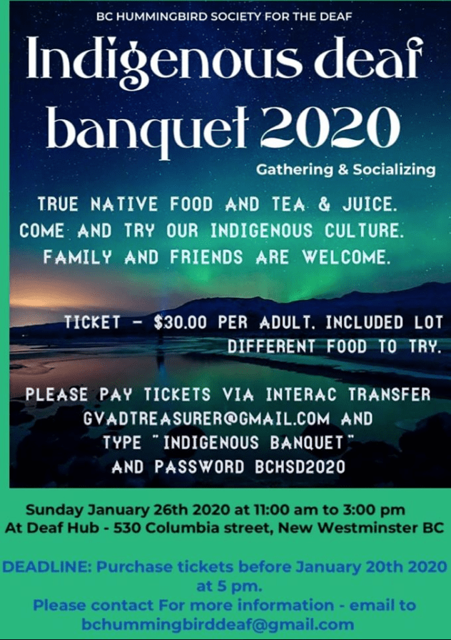 Sign in Welcome! Log into your account your username your password Forgot your password? Get help Create an account Create an account Welcome! Register for an account your email your username A password will be e-mailed to you. Password recovery Recover your password your email A password will be e-mailed to you. Indigenous Deaf Banquet 2020 – Jan 26 By Deaf BC January 16, 2020 All Postings Recent Articles ASL Slam Event April 25th Dorner - April 10, 2026 Workshops with ASL interpretation: Lines into the Air –... Dorner - April 2, 2026 GVAD & BCAD Host: Town Hall on Deaf Housing... Dorner - March 30, 2026 Van Slam FINALS ft. GC Vasquez Dorner - March 21, 2026 ASL Interpreted: 2026 Black Entrepreneurship and Research Symposium Dorner - March 21, 2026 Emergency Alert Project Hearing Focus Group Dorner - March 19, 2026 The Polyphonic Multilingual Creation Residency Showcase Dorner - March 19, 2026 Employment and Social Development Canada: Helping?older Canadians stay safe... Dorner - March 17, 2026 Deadline to apply for the position of Specialty Interpreter... Dorner - March 17, 2026 IBPOC Virtual Anti-Racism Meetings Registration Dorner - March 17, 2026 ASL Interpreted: Deaf-Friendly Visit to H.R. MacMillan Space Centre Dorner - March 17, 2026 ACE-BC: Participants needed for a study Dorner - March 9, 2026 GVAD 100-Year Celebration Gala – Tickets Are BACK! Dorner - March 6, 2026 ASL Interpreted Theatre: Otosan Dorner - March 4, 2026 FoodSafe Level 1 — Taught in ASL Dorner - March 1, 2026 Related Stories All Postings Emergency Alert Project Hearing Focus Group Dorner - March 19, 2026 All Postings The Polyphonic Multilingual Creation Residency Showcase Dorner - March 19, 2026 All Postings Employment and Social Development Canada: Helping?older Canadians stay safe during?Fraud Prevention?Month Dorner - March 17, 2026 All Postings Deadline to apply for the position of Specialty Interpreter Interns Dorner - March 17, 2026 All Postings GVAD Paint Night with Pamela E. Witcher Dorner - February 19, 2026 All Postings ASL: Music and Collective Access 2026 Dorner - February 16, 2026 Leave A ReplyLog in to leave a comment Stay on op - Ge the daily news in your inbox Subscribe