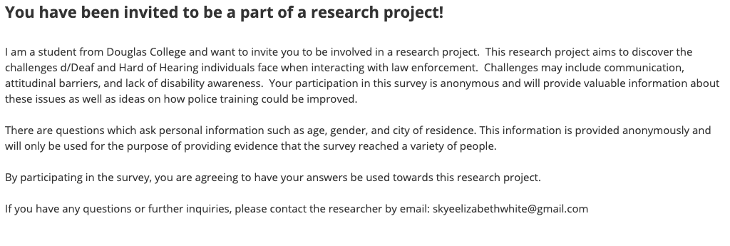 I have created an online survey to gather some data from Deaf community members who have had interactions with police officers.  I am trying to spread the word to get as many people involved as possible and if you could pass it along, it would be much appreciated.