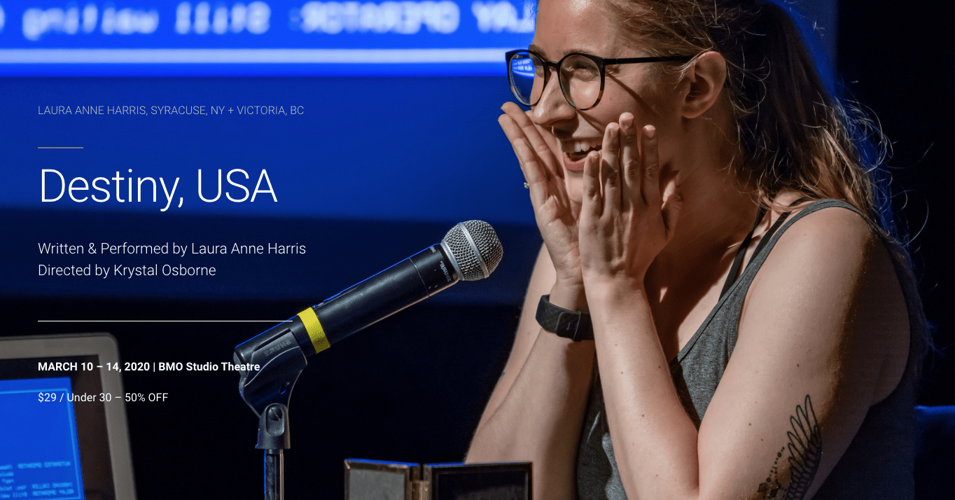 My name is Laura Anne Harris and I am the performer/writer of a show coming up at the Spark Festival at the Belfry Theatre titled, Destiny, USA. I will be holding a ASL interpreted show on Friday March 13th at 8pm with ASL interpreter Katt Campbell. I have eight comps available to give out to the Deaf community including interpreters or any folk that wouldn’t be able to afford a ticket to the show.