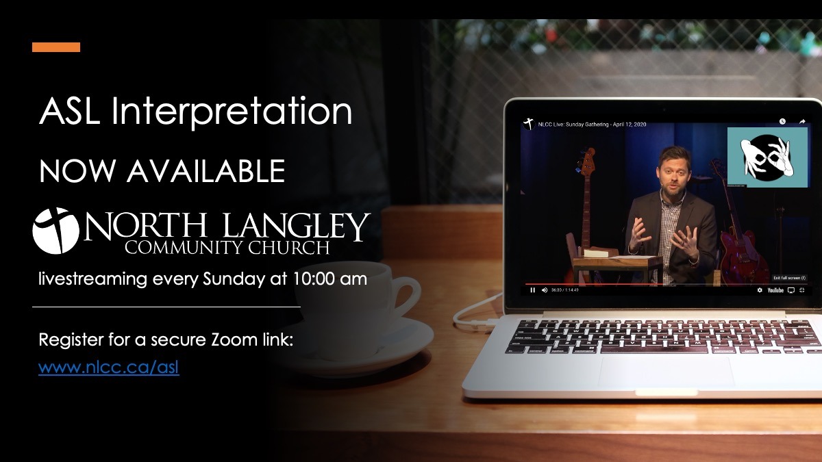Beginning May 10, 2020, North Langley Community Church will provide live-streamed professional ASL interpretation of our Sunday morning worship online. More information can be found on our website at www.nlcc.ca/asl (beginning May 4), and the stream can be accessed on Youtube here.
