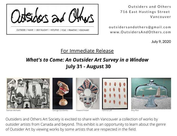 Outsiders and Others Art Society is excited to share with Vancouver a collection of works by outsider artists from Canada and beyond. This exhibit is an opportunity to learn about the genre of Outsider Art by viewing works by some artists that are respected in the field.
