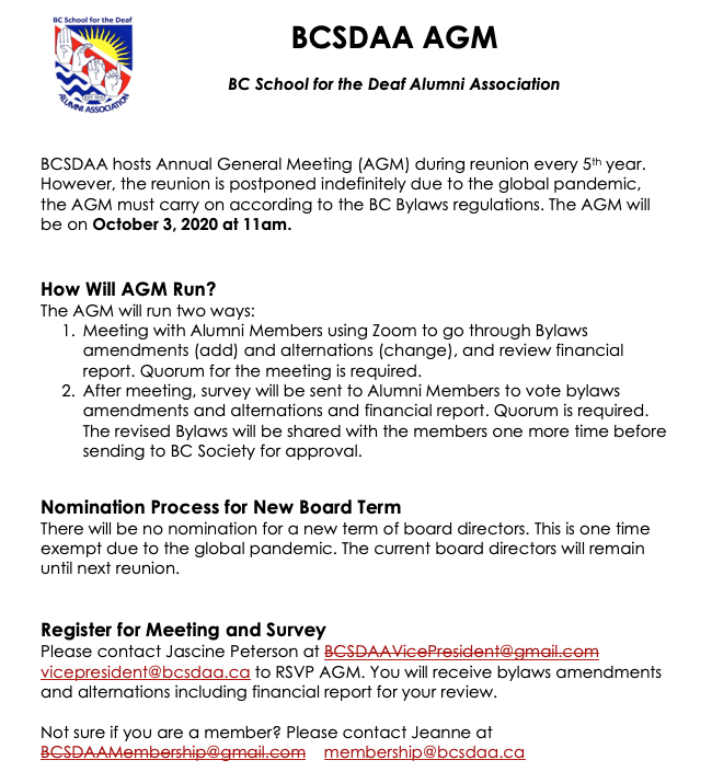 Sign in Welcome! Log into your account your username your password Forgot your password? Get help Create an account Create an account Welcome! Register for an account your email your username A password will be e-mailed to you. Password recovery Recover your password your email A password will be e-mailed to you. BCSDAA AGM October 3 By Deaf BC August 3, 2020 All Postings BCSDAA AGM – 2020-9 Recent Articles Workshops with ASL interpretation: Lines into the Air –... Dorner - April 2, 2026 GVAD & BCAD Host: Town Hall on Deaf Housing... Dorner - March 30, 2026 Van Slam FINALS ft. GC Vasquez Dorner - March 21, 2026 ASL Interpreted: 2026 Black Entrepreneurship and Research Symposium Dorner - March 21, 2026 Emergency Alert Project Hearing Focus Group Dorner - March 19, 2026 The Polyphonic Multilingual Creation Residency Showcase Dorner - March 19, 2026 Employment and Social Development Canada: Helping?older Canadians stay safe... Dorner - March 17, 2026 Deadline to apply for the position of Specialty Interpreter... Dorner - March 17, 2026 IBPOC Virtual Anti-Racism Meetings Registration Dorner - March 17, 2026 ASL Interpreted: Deaf-Friendly Visit to H.R. MacMillan Space Centre Dorner - March 17, 2026 ACE-BC: Participants needed for a study Dorner - March 9, 2026 GVAD 100-Year Celebration Gala – Tickets Are BACK! Dorner - March 6, 2026 ASL Interpreted Theatre: Otosan Dorner - March 4, 2026 FoodSafe Level 1 — Taught in ASL Dorner - March 1, 2026 ODF: ASL Research and Resource Development Research Fund Dorner - February 27, 2026 Related Stories All Postings Emergency Alert Project Hearing Focus Group Dorner - March 19, 2026 All Postings The Polyphonic Multilingual Creation Residency Showcase Dorner - March 19, 2026 All Postings Employment and Social Development Canada: Helping?older Canadians stay safe during?Fraud Prevention?Month Dorner - March 17, 2026 All Postings Deadline to apply for the position of Specialty Interpreter Interns Dorner - March 17, 2026 All Postings GVAD Paint Night with Pamela E. Witcher Dorner - February 19, 2026 All Postings ASL: Music and Collective Access 2026 Dorner - February 16, 2026 Leave A ReplyLog in to leave a comment Stay on op - Ge the daily news in your inbox Subscribe