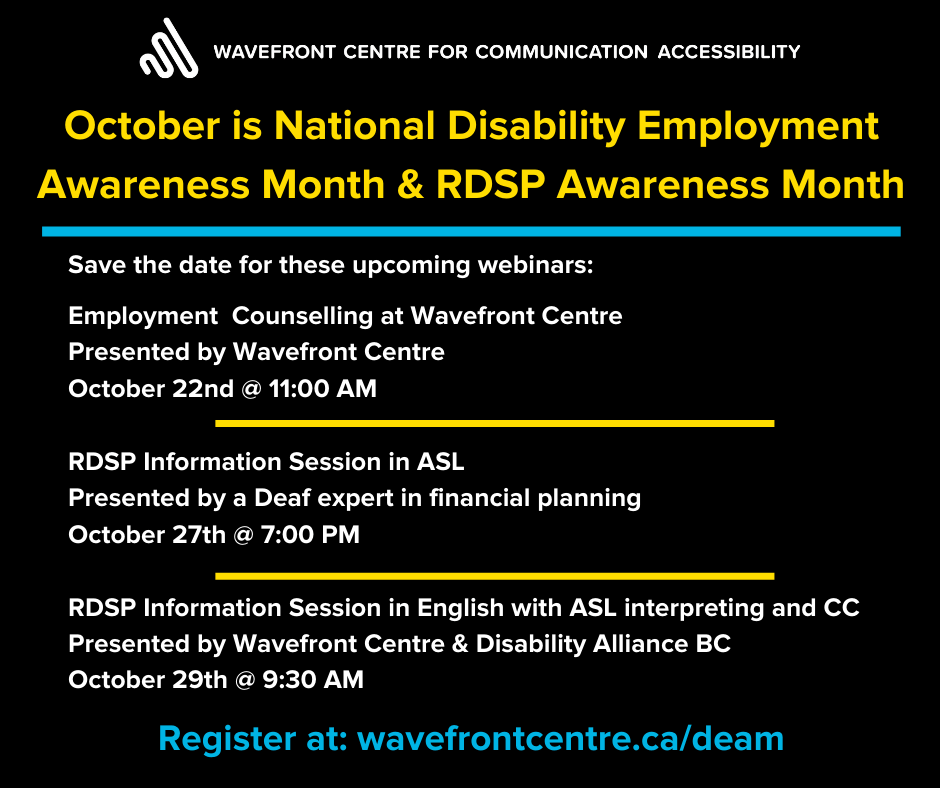 Disability Employment Awareness Month is an annual awareness campaign that takes place each October. Wavefront Centre for Communication Accessibility will host several virtual sessions. See below for more details and to register or visit https://www.wavefrontcentre.