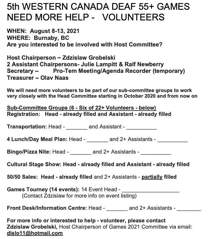 Western Canada Deaf 55+Games Volunteers Needed
