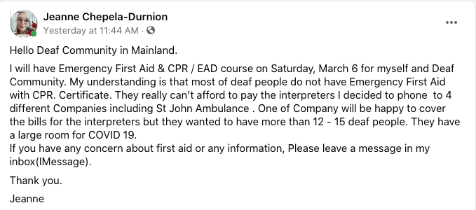 I will have Emergency First Aid & CPR / EAD course on Saturday, March 6 for myself and Deaf Community. My understanding is that most of deaf people do not have Emergency First Aid with CPR. Certificate. They really can’t afford to pay the interpreters I decided to phone to 4 different Companies including St John Ambulance . One of Company will be happy to cover the bills for the interpreters but they wanted to have more than 12 – 15 deaf people. They have a large room for COVID 19.