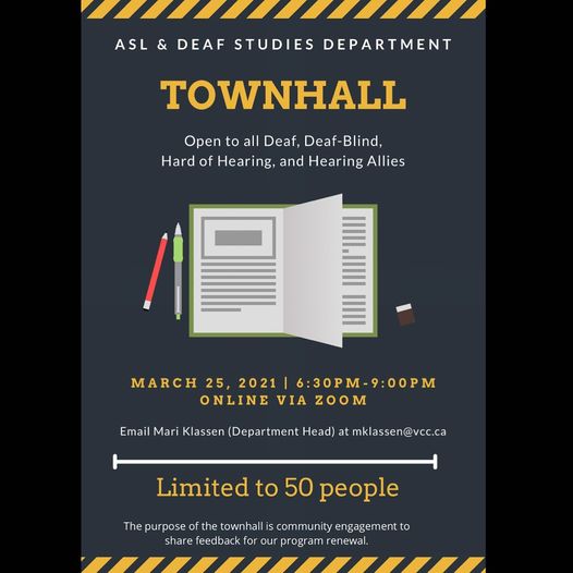 Sign in Welcome! Log into your account your username your password Forgot your password? Get help Create an account Create an account Welcome! Register for an account your email your username A password will be e-mailed to you. Password recovery Recover your password your email A password will be e-mailed to you. TONIGHT!!! ASL & Deaf Studies Townhall By Deaf BC March 25, 2021 All Postings ASL & Deaf Studies Townhall The purpose of the townhall is community engagement to share feedback for our program renewal. March 25, 2021 (6:30pm-9:00pm) Register: Email mklassen@vcc.ca Recent Articles Workshops with ASL interpretation: Lines into the Air –... Dorner - April 2, 2026 GVAD & BCAD Host: Town Hall on Deaf Housing... Dorner - March 30, 2026 Van Slam FINALS ft. GC Vasquez Dorner - March 21, 2026 ASL Interpreted: 2026 Black Entrepreneurship and Research Symposium Dorner - March 21, 2026 Emergency Alert Project Hearing Focus Group Dorner - March 19, 2026 The Polyphonic Multilingual Creation Residency Showcase Dorner - March 19, 2026 Employment and Social Development Canada: Helping?older Canadians stay safe... Dorner - March 17, 2026 Deadline to apply for the position of Specialty Interpreter... Dorner - March 17, 2026 IBPOC Virtual Anti-Racism Meetings Registration Dorner - March 17, 2026 ASL Interpreted: Deaf-Friendly Visit to H.R. MacMillan Space Centre Dorner - March 17, 2026 ACE-BC: Participants needed for a study Dorner - March 9, 2026 GVAD 100-Year Celebration Gala – Tickets Are BACK! Dorner - March 6, 2026 ASL Interpreted Theatre: Otosan Dorner - March 4, 2026 FoodSafe Level 1 — Taught in ASL Dorner - March 1, 2026 ODF: ASL Research and Resource Development Research Fund Dorner - February 27, 2026 Related Stories All Postings Emergency Alert Project Hearing Focus Group Dorner - March 19, 2026 All Postings The Polyphonic Multilingual Creation Residency Showcase Dorner - March 19, 2026 All Postings Employment and Social Development Canada: Helping?older Canadians stay safe during?Fraud Prevention?Month Dorner - March 17, 2026 All Postings Deadline to apply for the position of Specialty Interpreter Interns Dorner - March 17, 2026 All Postings GVAD Paint Night with Pamela E. Witcher Dorner - February 19, 2026 All Postings ASL: Music and Collective Access 2026 Dorner - February 16, 2026 Leave A ReplyLog in to leave a comment Stay on op - Ge the daily news in your inbox Subscribe