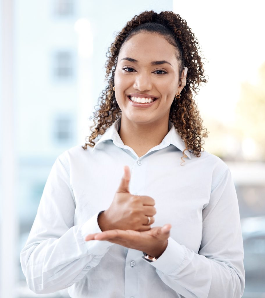The image shows a young woman standing indoors in front of a bright, softly blurred background with large windows. The person is wearing a light-colored, long-sleeved button-up shirt. Their hair is curly and pulled back. The individual is using American Sign Language (ASL): one hand is held horizontally, palm facing upward, while the other forms a thumbs-up gesture and rests on top of the open palm. This gesture represents the ASL sign for “help.” The lighting is natural and bright, giving the scene a clean and professional appearance.