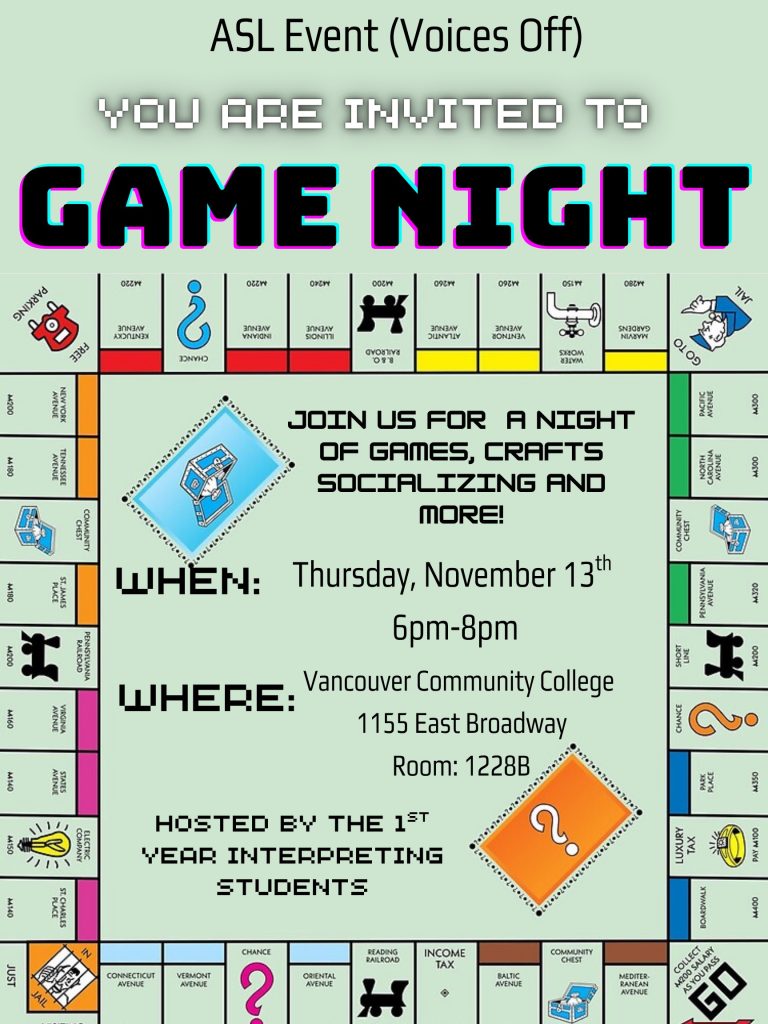 Poster for Game Night hosted by the VCC first year interpreter students.