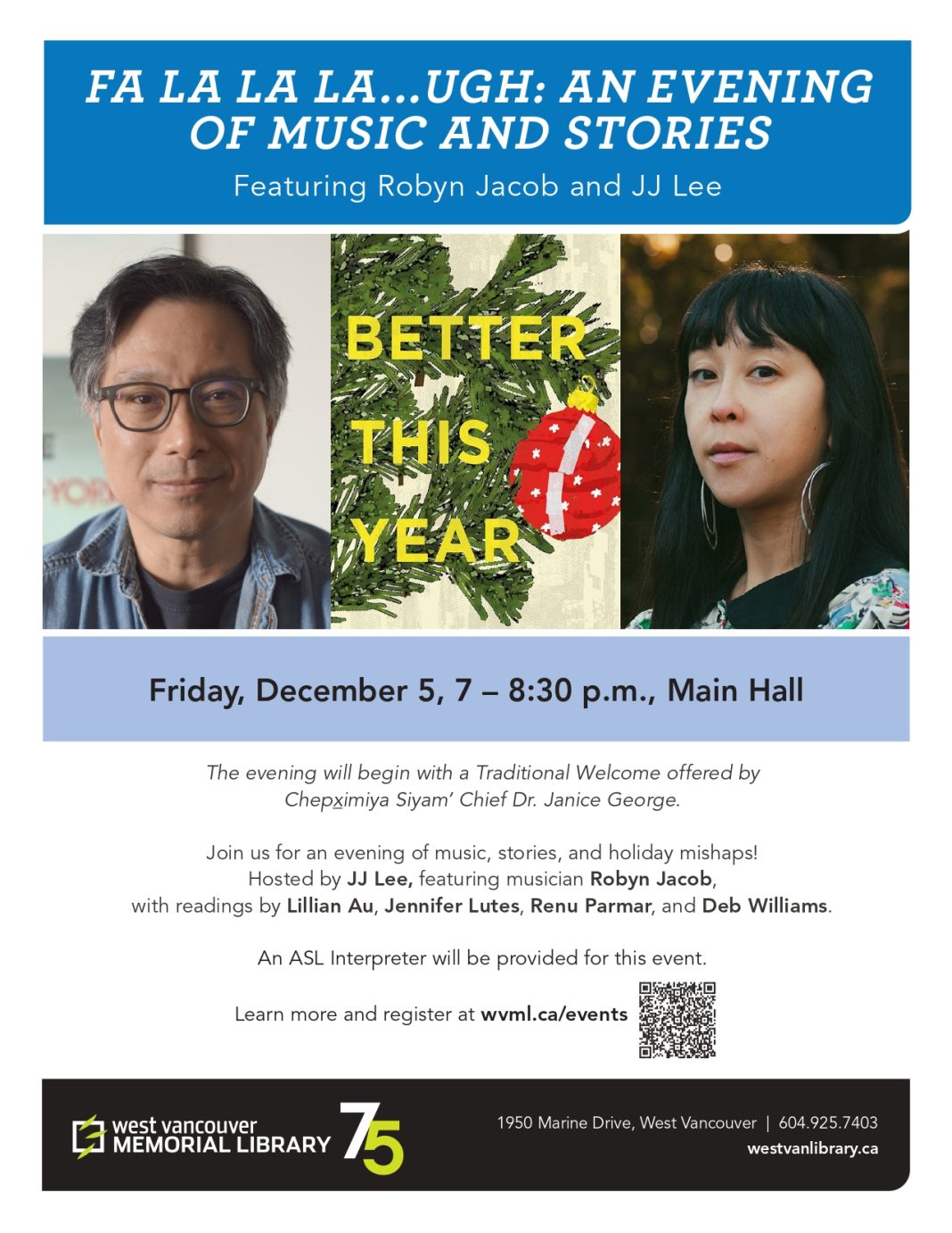 More information and registration: https://westvanlibrary.ca/event/fa-la-la-la-ugh-an-evening-of-music-and-stories-featuring-robyn-jacob-and-jj-lee/