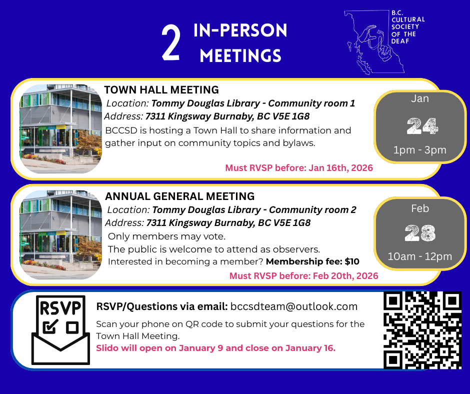 A blue and yellow flyer titled “2 In-Person Meetings” from the British Columbia Cultural Society of the Deaf (BCCSD). The flyer announces two events at Tommy Douglas Library in Burnaby. A Community Town Hall will be held on January 24, 2026 (1:00–3:00 PM), and an Annual General Meeting (AGM) will take place on February 28, 2026 (10:00 AM–12:00 PM). The flyer includes RSVP deadlines, an email contact (bccsdteam@outlook.com), and a QR code for submitting questions in advance. For the AGM, the flyer notes that only members may vote, the public may attend as observers, the membership fee is $10, and the RSVP deadline is February 20, 2026.