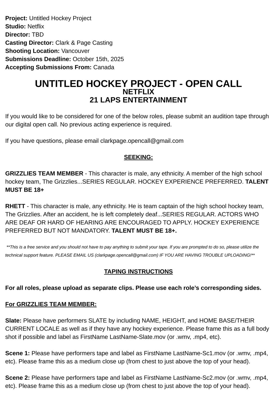 Clark & Page Casting is holding an open casting call for a new Netflix/21 Laps series ‘UNTITLED HOCKEY PROJECT’. We are seeking a Deaf/hard of hearing hockey player, 18+ to play 16–17 years old for the role of RHETT. Character description and link to our open call below.